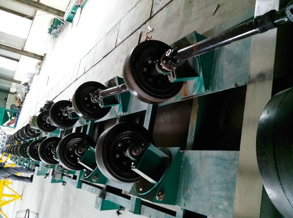 傳動(dòng)線解決中大型管道進(jìn)行內(nèi)、外防腐作業(yè)時(shí)管子的進(jìn)給問題。它包括主動(dòng)輪組件、從動(dòng)輪組件、回轉(zhuǎn)盤、滑座、中心距調(diào)節(jié)機(jī)構(gòu)、中心距鎖止機(jī)構(gòu)、螺旋角調(diào)節(jié)機(jī)構(gòu)和螺旋角鎖止機(jī)構(gòu),所述主動(dòng)輪組件和從動(dòng)輪組件分別固定在對(duì)應(yīng)的回轉(zhuǎn)盤上,所述回轉(zhuǎn)盤安裝在滑座上,所述滑座與中心距調(diào)節(jié)機(jī)構(gòu)及中心距鎖止機(jī)構(gòu)配裝,所述螺旋角調(diào)節(jié)機(jī)構(gòu)與回轉(zhuǎn)盤配裝,所述螺旋角鎖止機(jī)構(gòu)安裝在滑座上,它與螺旋角調(diào)節(jié)機(jī)構(gòu)匹配。本實(shí)用新型不僅可降低操作人員的勞動(dòng)強(qiáng)度、提高工作效率,而且能保證管道螺旋傳動(dòng)線上各輪組之間參數(shù)的一致性。